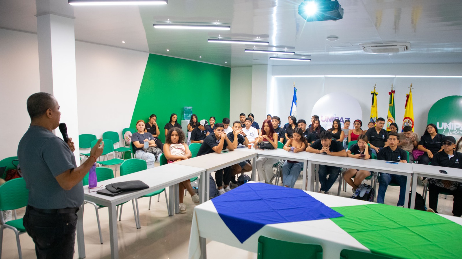 Durante la jornada, diferentes dependencias institucionales socializaron sus procesos y servicios, brindando a los estudiantes una visión integral del funcionamiento universitario y fortaleciendo su sentido de pertenencia desde el inicio de su formación. En el horario diurno participaron representantes de Bienestar Universitario, Registro y Control, Lenguas Extranjeras, Centro de Información y Gestión Humana. De igual manera, estas dependencias acompañaron el espacio en la jornada nocturna, garantizando una cobertura institucional completa para todos los asistentes.