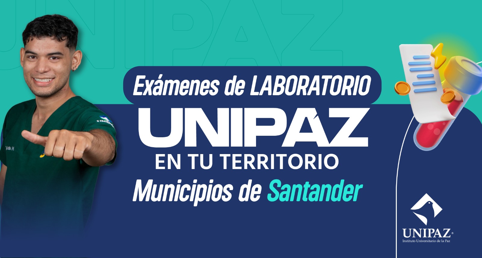El Instituto Universitario de la Paz -UNIPAZ-, se permite informar a los admitidos en los municipios de Santander, incluidos en la estrategia UNIPAZ en Tú Territorio, los pasos que deberán seguir en relación a los Exámenes Médico y de Laboratorio; y la Compra del Seguro Estudiantil, acciones fundamentales para iniciar el proceso de Matrícula